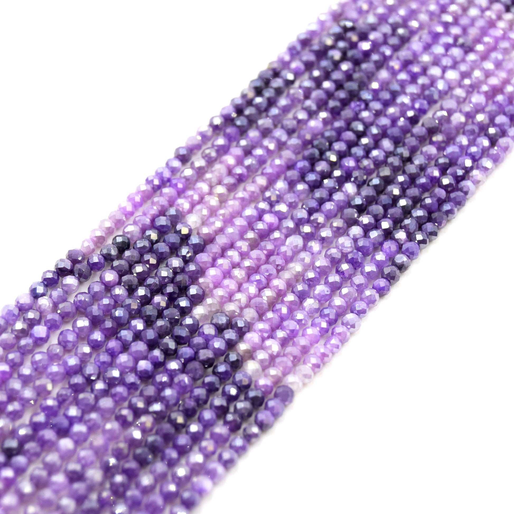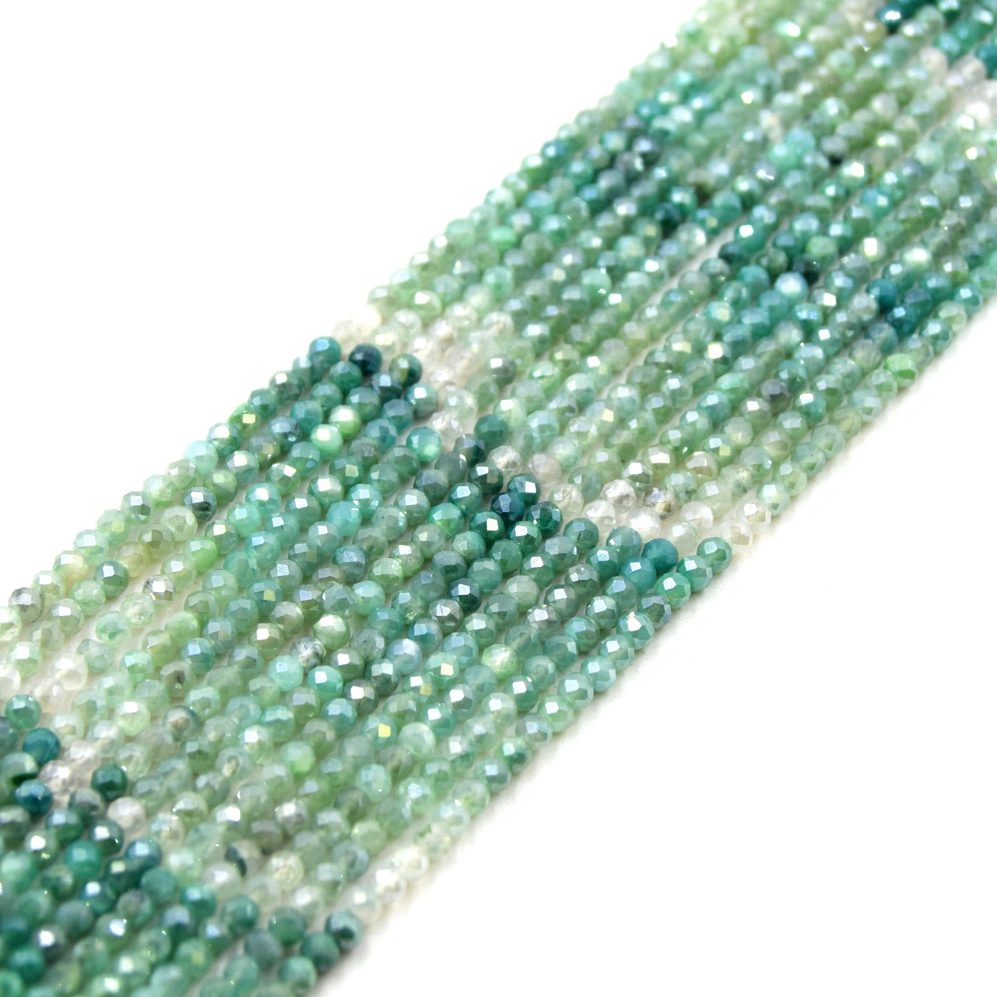 The Mystic Shaded Quartz Beads are made from natural dyed quartz, featuring an AB (Aurora Borealis) coating that gives them a stunning iridescent finish. These beads are micro-faceted in a rondelle shape, measuring approximately 2.5mm x 3mm. The beads come in a variety of colors, including green, purple, and blue. Each strand is 13 inches long and contains approximately 130 beads, making them perfect for various jewelry making projects.