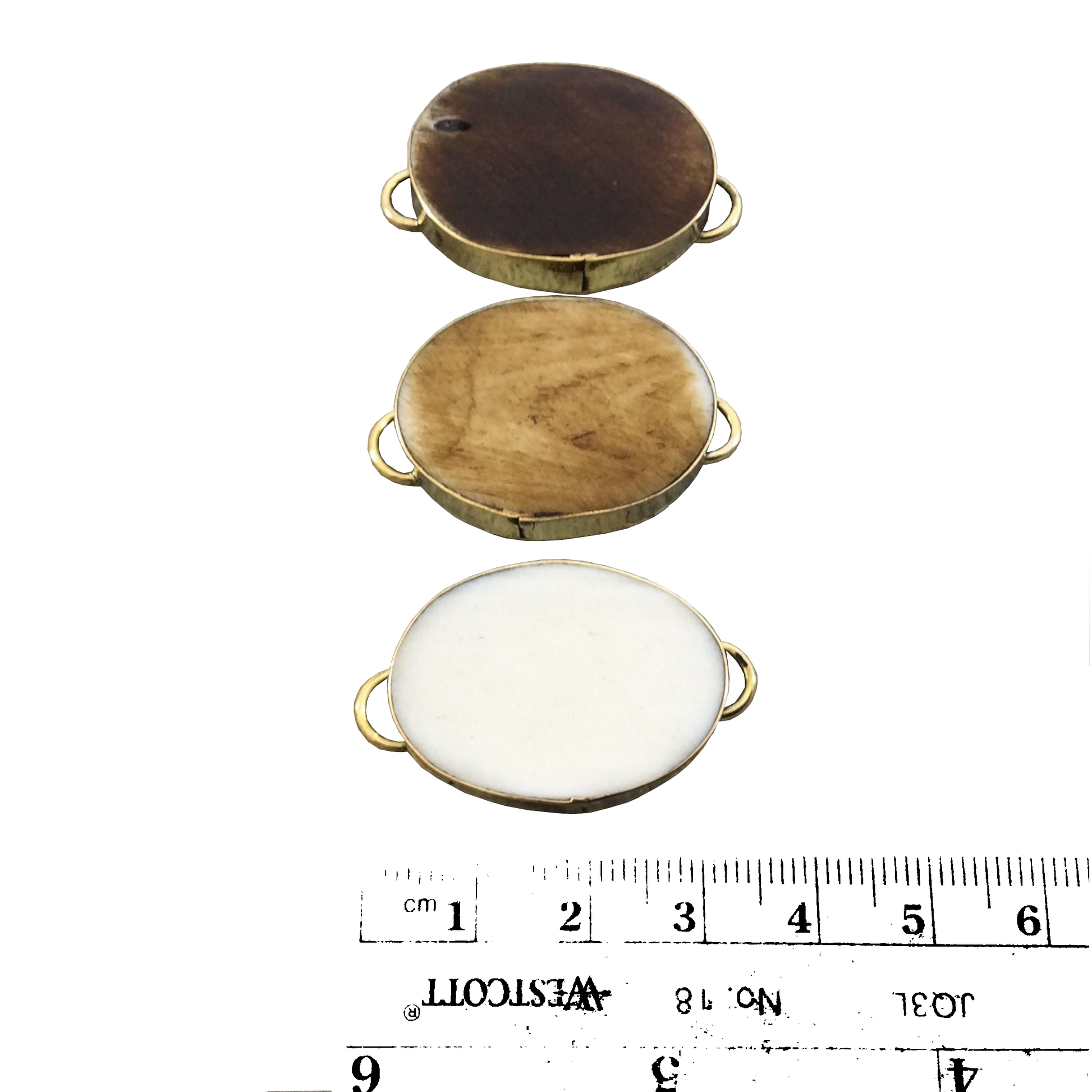 Description: This Large Oval Bone Connector is a beautifully crafted piece made from natural ox bone and plated copper. Its elegant fat oval bezel design, paired with gold edging and two suspension rings, makes it a versatile and sophisticated component for jewelry-making. Measuring approximately 21mm x 29mm, each connector is sold individually and chosen randomly from stock.